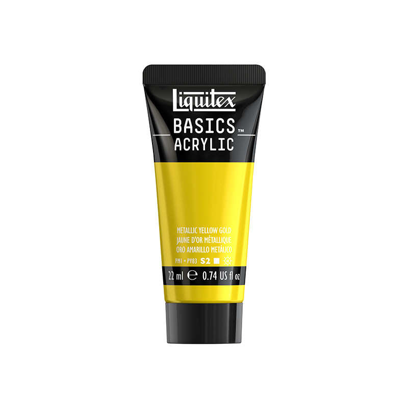 Metallic Yellow Gold / Metaliczny żółto-złoty. Farba akrylowa serii Basics amerykańskiej firmy Liquitex. Kolor nr 343. Tuba o pojemności 22 ml. Więcej szczegółów