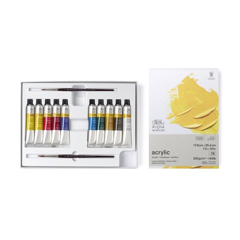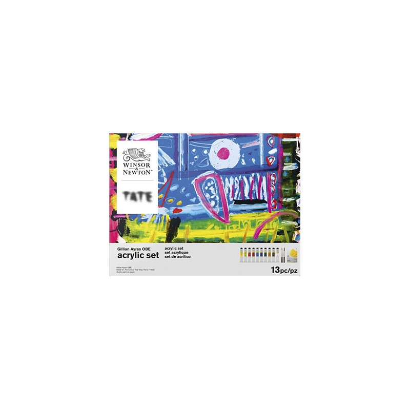 Zestaw Gillian Ayres OBE Acrylic Set marki Winsor & Newton. 13-elementowy komplet: 10 farb akrylowych, 2 x pędzel oraz blok do akryli 17,8 x 25,4 cm. Więcej szczegółów