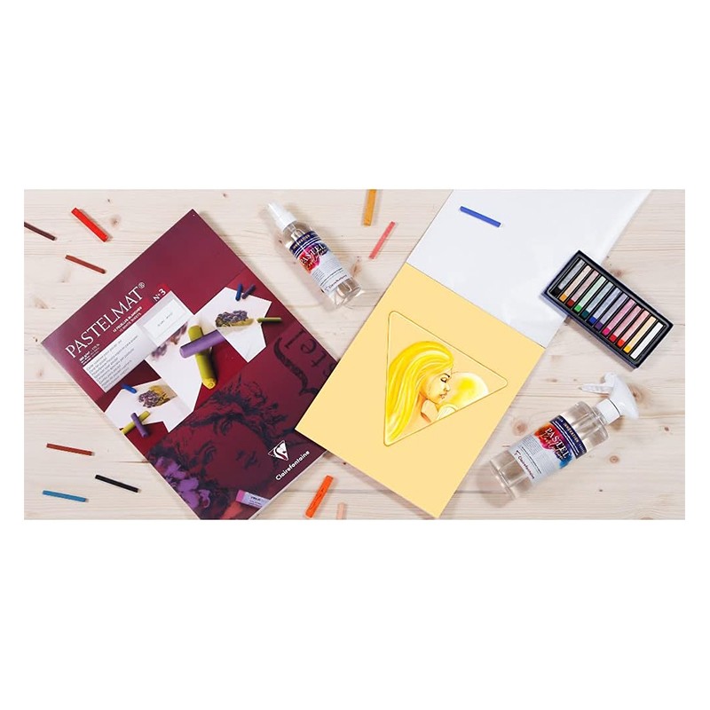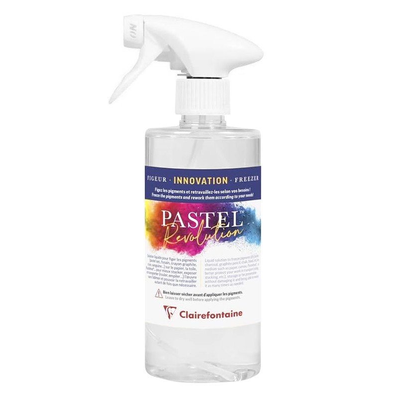 Innowacyjna fiksatywa do pasteli suchych marki Clairefontaine. Pastel Revolution Freezer utrwala i unieruchamia sypkie pigmenty suchych pasteli na takich podłożach jak papier Pastelmat, drewno, płótno, karton lub innych podłożach przygotowanych za pomocą specjalnych gruntów. 'Freezer' zabezpiecza delikatne warstwy tworzone suchymi pastelami bez zmiany ich kolorów oraz bez żółknięcia podłoża. Fiksatywa Revolution Freezer może być stosowana jako fiksatywa retuszerska w trakcie pracy, pomiędzy warstwami i etapami tworzenia obrazu.
