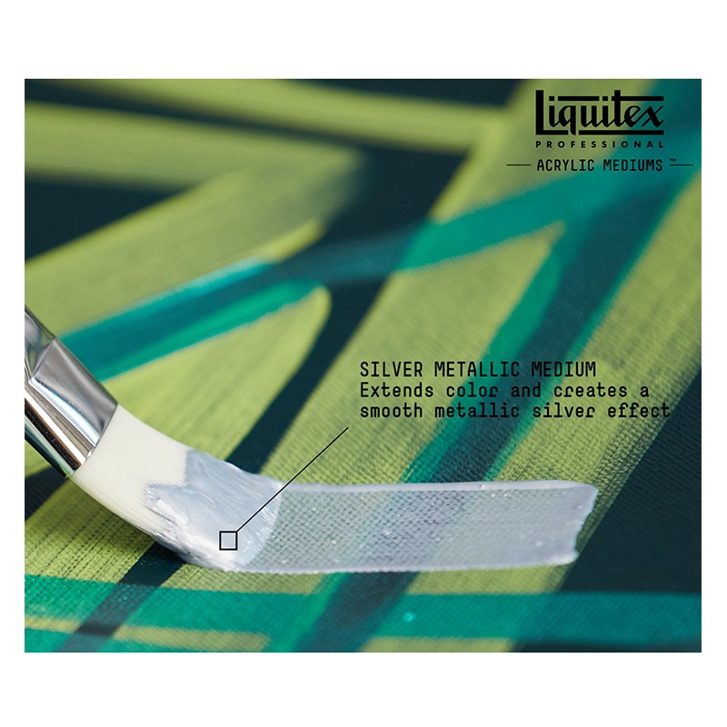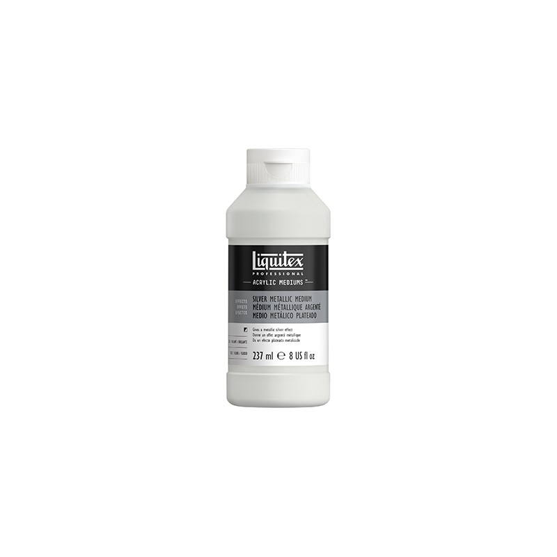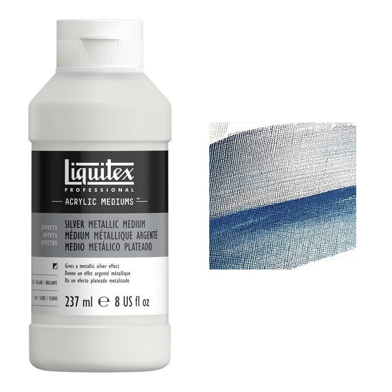 Silver Metallic Medium Liquitex – srebrne, metaliczne medium marki Liquitex do mieszania z farbami akrylowymi. Butelka o pojemności 237 ml.