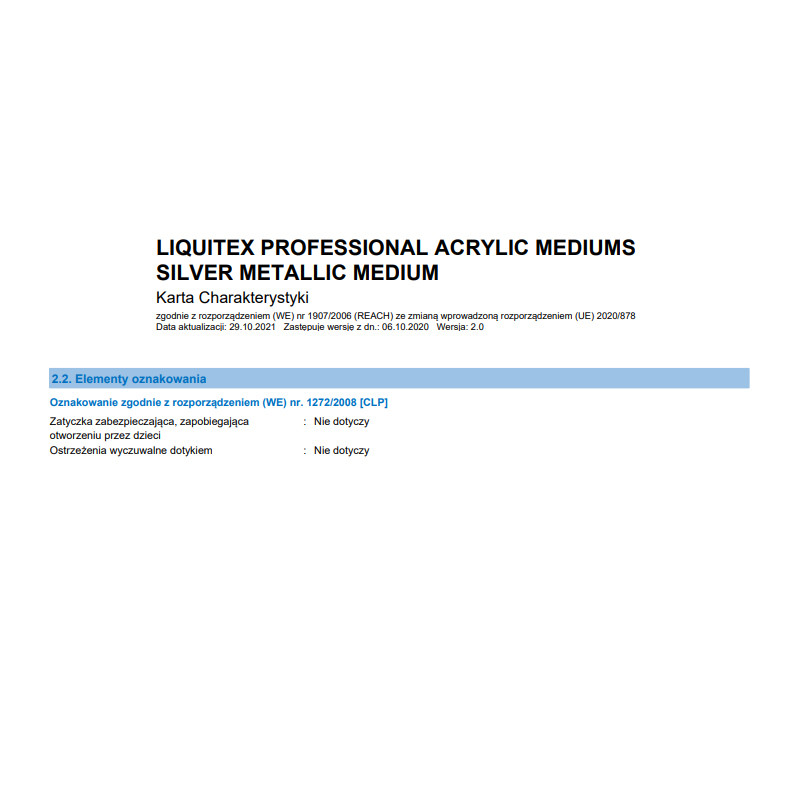 Metaliczne medium w kolorze srebrnym marki Liquitex. Produkt przeznaczony do mieszania z farbami akrylowymi w celu nadania im srebrnego, połyskującego wykończenia lub do samodzielnego nakładania. Drobno zmielona srebrna mika zawarta w medium, nadaje pracom metalicznego połysku - najlepsze efekty uzyskamy przy połączeniu medium z farbami transparentnymi. Medium może być nakładane bezpośrednio z butelki - nadaje powierzchni srebrny blask. Srebrne medium w płynie spowalnia czas schnięcia farby oraz wzmacnia jej kolor. Jeśli podczas mieszania medium pojawią się pęcherzyki powietrza należy zostawić je i poczekać aż się uniosą i znikną. Silver Metallic Medium po wyschnięciu jest wodoodporne, nieżółknące i elastyczne. Nie ulega spękaniom oraz jest odporne na promienie UV. Jest kompatybilne ze wszystkimi produktami marki Liquitex.