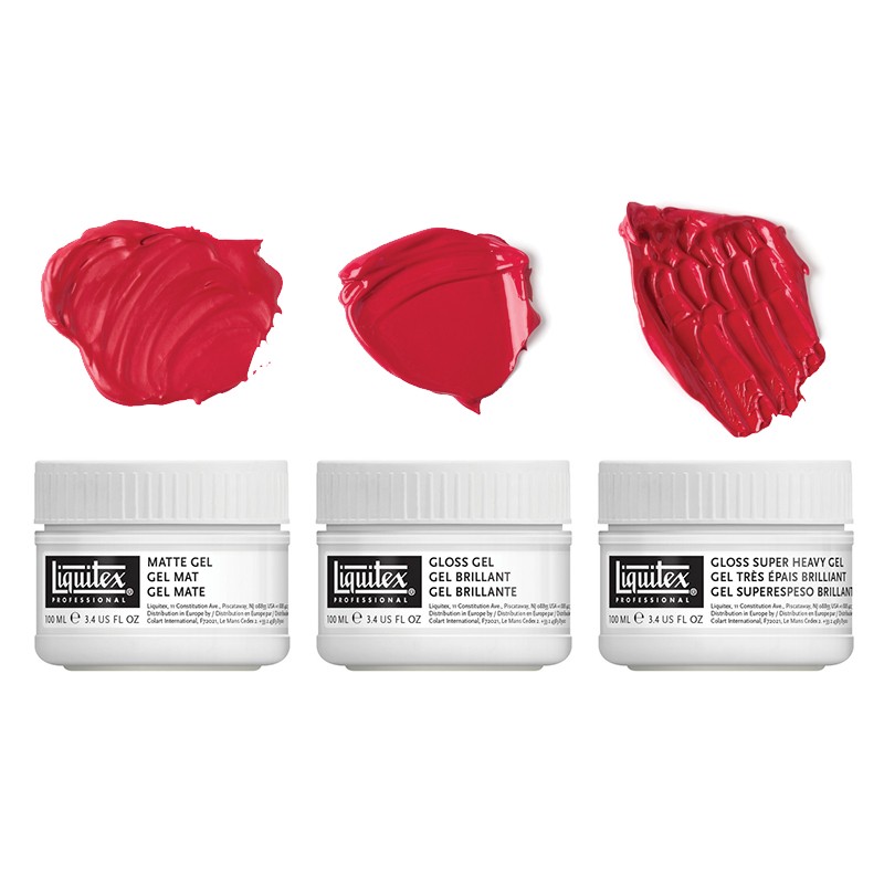 Trial Set – Gel Mediums. 3 żelowe media marki Liquitex do mieszania z farbami akrylowymi w celu zmiany ich właściwości.