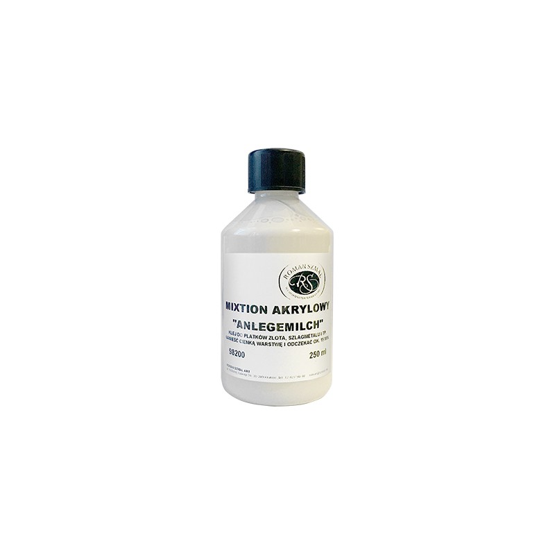 Mixtion akrylowy Anlegemilch marki Roman Szmal Art, do przyklejania płatków złota, szlagmetalu itp. Gotowy w 15 minut. Butelka o pojemności 250 ml. Więcej szczegółów
