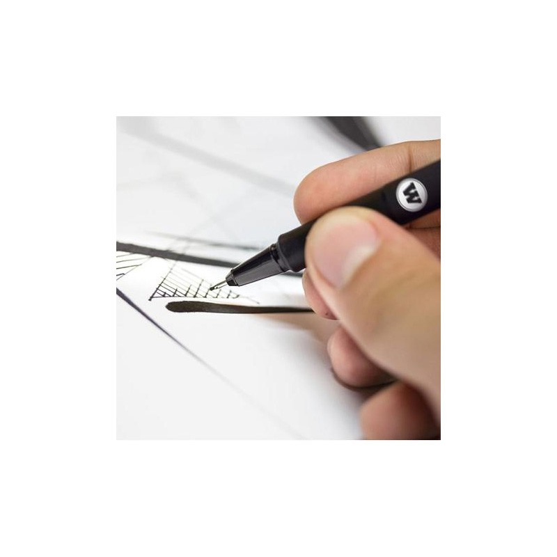 Obudowa cienkopisu jest matowa i antypoślizgowa dzięki czemu narzędzie wygodnie leży w dłoni. Pigmentowy, nietoksyczny tusz jest kryjący i permanentny – odporny na zmywanie wodą oraz chemikaliami. Świetnie sprawdza się przy szablonach i kreśleniu konturów. Dzięki funkcji Cap–Off cienkopis pozostawiony bez skuwki przez 3 godziny nie ulega wyschnięciu.