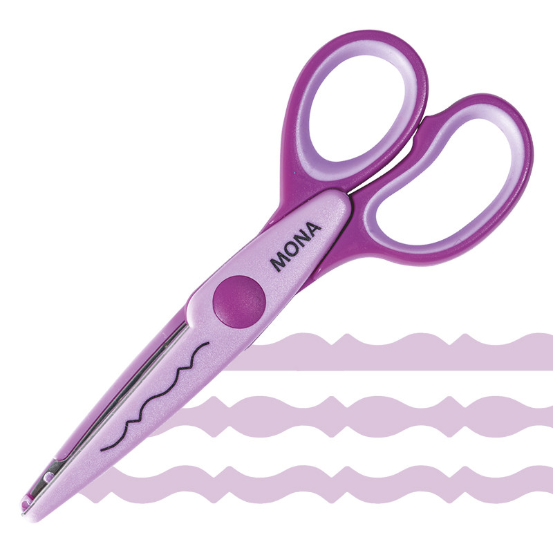 Nożyczki przeznaczone do wycinania ozdobnych wzorów w papierze. Ostrze zaprojektowano w ten sposób aby było bezpieczne w użytkowaniu dla dzieci. Nożyczki można wykorzystać do prac plastycznych, tworzenia w technice scrapbookingu, kart okolicznościowych itp. Na plastikowej części nożyczek nadrukowano wzór taki, jaki powstaje podczas cięcia. Nożyczki z systemem Soft Touch - posiadają ogumienie wewnątrz otworów na palce. Ostrza wykonane z metalu odpornego na rdzę.