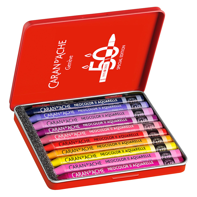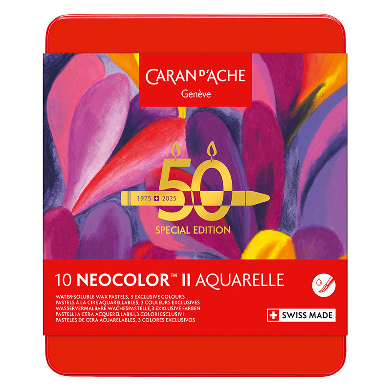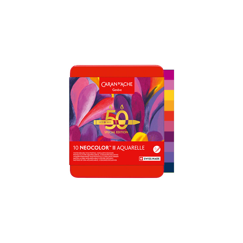 Limitowana edycja kultowych woskowych pasteli olejnych Neocolor marki Caran d'Ache. Pastele akwarelowe rozpuszczają się w wodzie – ich kremowa konsystencja, aksamitna faktura i intensywne kolory sprawiają, że praca nimi jest bardzo przyjemna i satysfakcjonująca. Pastele NEOCOLOR II Aquarelle są wysoce odporne na światło, przez co nie zmieniają swoich kolorów przez długi czas. 10 sztyftów o średnicy 8.65 mm umieszczono w klasycznym, metalowym etui w kolorze czerwonym.