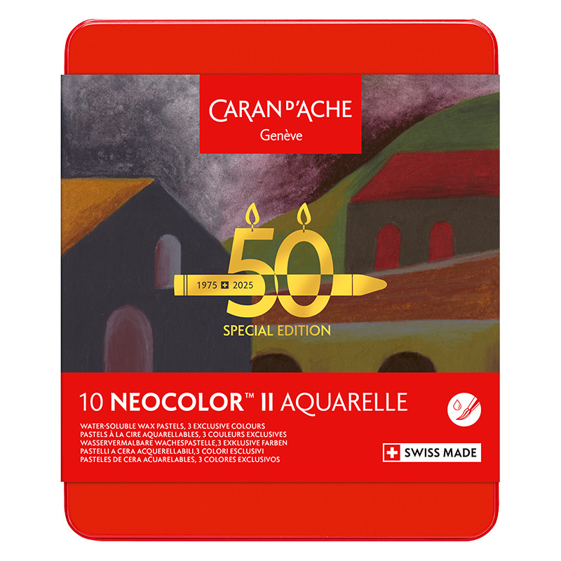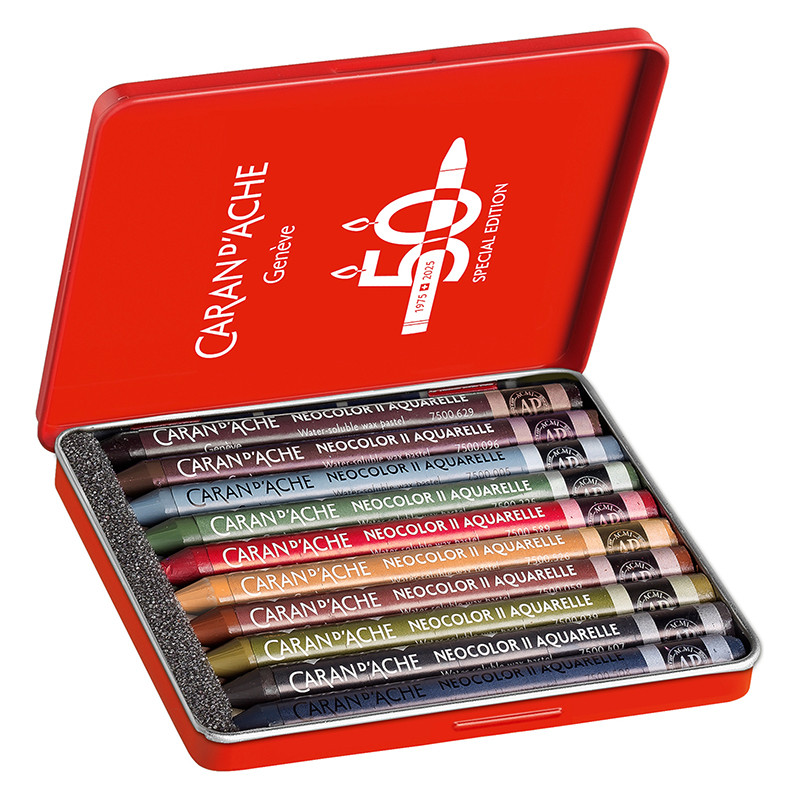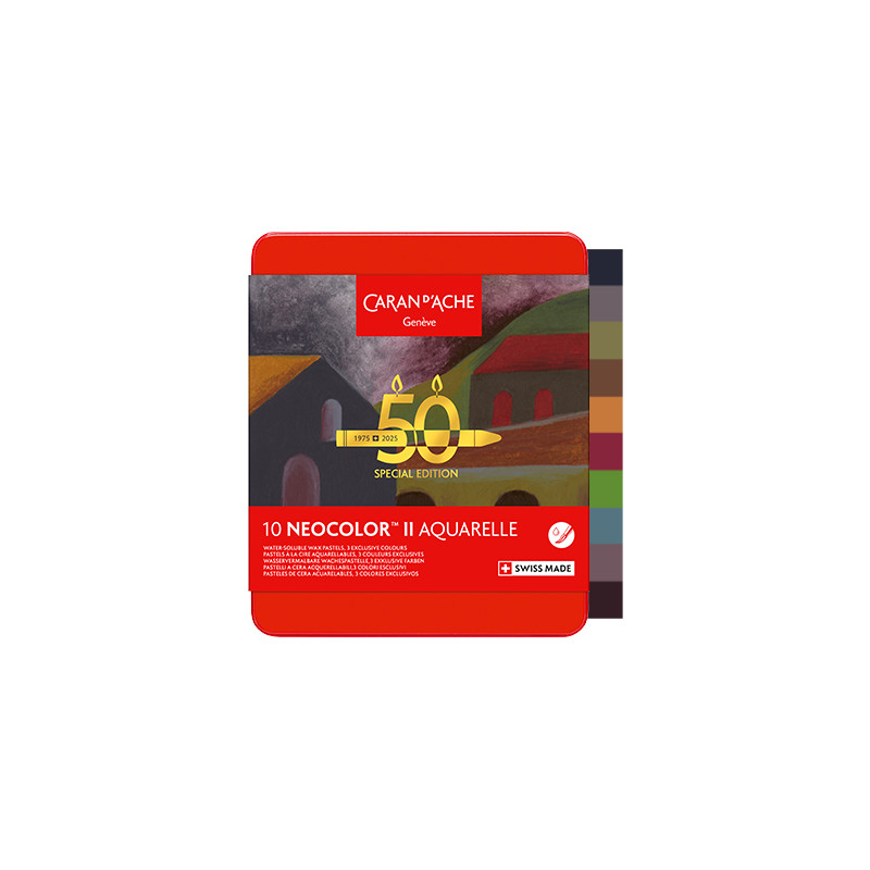 Limitowana edycja kultowych woskowych pasteli olejnych Neocolor marki Caran d'Ache. Pastele akwarelowe rozpuszczają się w wodzie – ich kremowa konsystencja, aksamitna faktura i intensywne kolory sprawiają, że praca nimi jest bardzo przyjemna i satysfakcjonująca. Pastele NEOCOLOR II Aquarelle są wysoce odporne na światło, przez co nie zmieniają swoich kolorów przez długi czas. 10 sztyftów o średnicy 8.65 mm umieszczono w klasycznym, metalowym etui w kolorze czerwonym.
