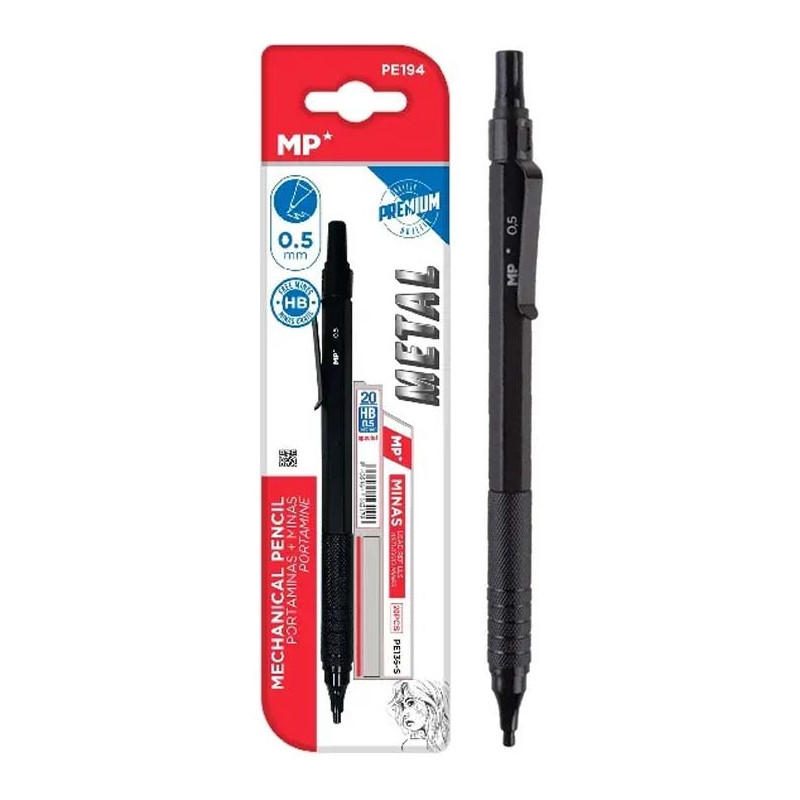 Ołówek automatyczny 0.5 mm marki MP + wkłady zapasowe o miękkości HB. Metalowa obudowa. Więcej szczegółów