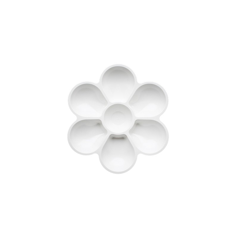 Plastikowa paleta malarska w kształcie kwiatka - 7 komór, 18 cm średnicy. Polecana szczególnie do farb akrylowych, temper, akwareli.