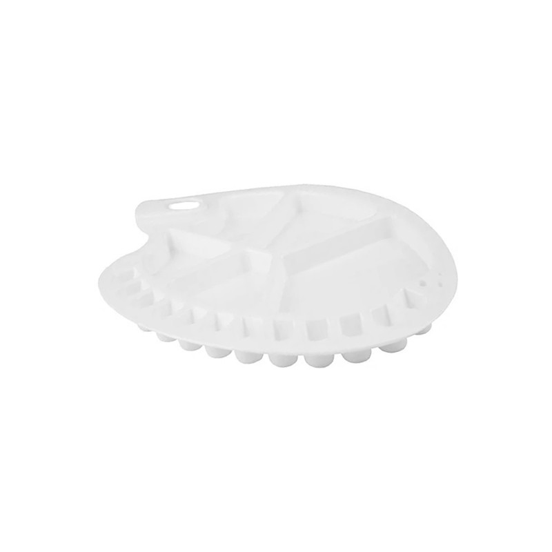 Paleta malarska wykonana z plastiku, posiada 12 komór oraz 5 dużych przestrzeni do mieszania kolorów. Klasyczny owalny kształt i otwór na kciuk ułatwiają pracę. Lekka, plastikowa paleta może być stosowana do farb akrylowych, temper i akwareli. Biały odcień tworzywa pomaga w identyfikacji kolorów. Głębokie komory o wysokości około 1 cm pozwalają na mieszanie duże ilości farby. Paleta posiada 3 otwory na pędzle o różnej średnicy.