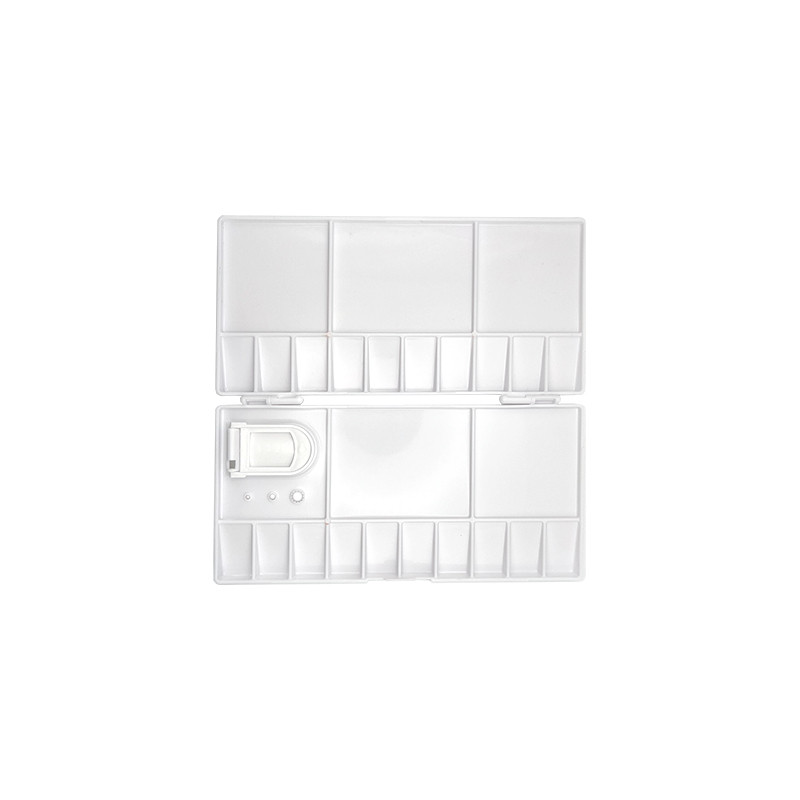 20 komór na farbę + 5 większych powierzchni do mieszania, wygodny uchwyt na palec oraz 3 otwory na pędzle. wymiary palety po rozłożeniu: 19 x 20 cm.