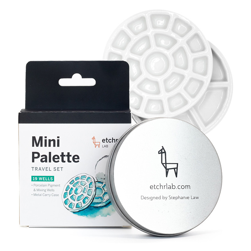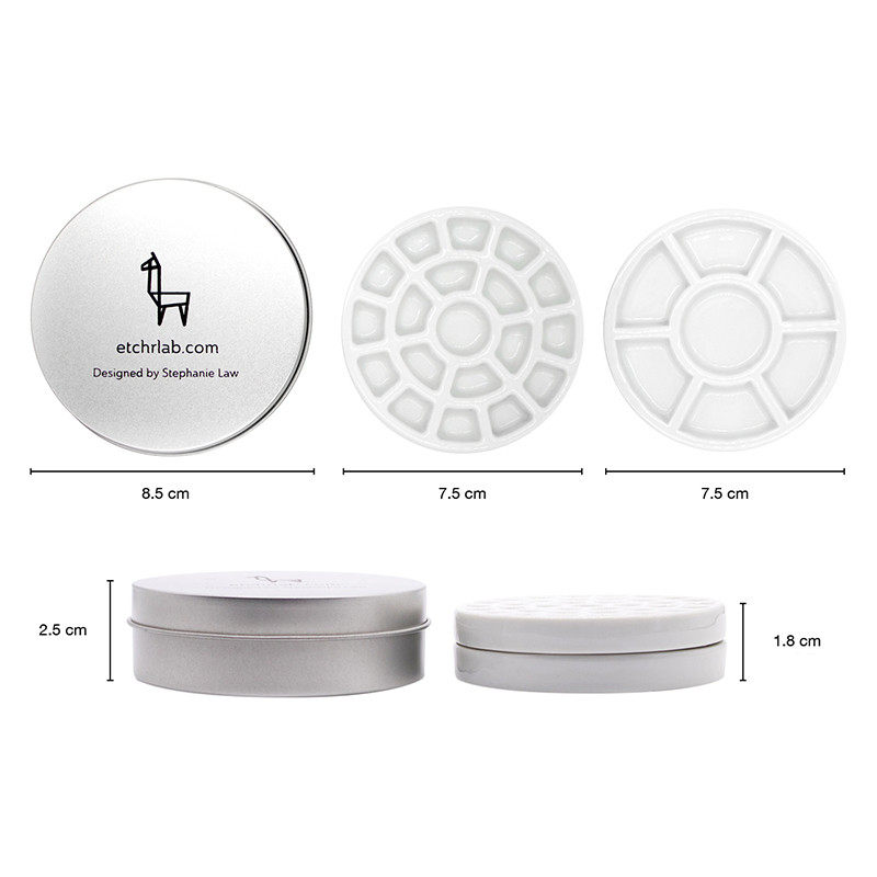 Porcelanowa paleta malarska - idealne rozwiązanie do pracy w plenerze czy podróży. Okrągłe metalowe pudełko skrywa w sobie zestaw 2 porcelanowych palet. Jedna z nich posiada 19 wgłębień do których można wycisnąć farbę akwarelową z tubki. Druga paleta posiada 7 wgłębień w których wygodnie zmieszamy kolory. Neutralna, czysta biel palet doskonale i niezmiennie eksponuje nakładane barwy. Szkliwiona powierzchnia nie przyjmuje pigmentów (nie odbarwia się) i jest łatwa w czyszczeniu. Metalowe pudełko zawiera dwie palety, filcowe przekładki ochronne oraz arkusz papieru akwarelowego do stworzenia próbnika kolorów. Średnica każdej z palet wynosi 7.5 cm (średnica pudełka to 8.5 cm). Produkt powstał w kolaboracji amerykańskiej akwarelistki Stephanie Law @spmlaw wraz z marką Etchr Lab.