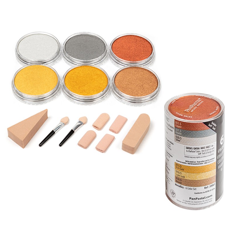 Komplet "Metallic" - kolory metaliczne. Komplet artystycznych pasteli suchych PanPastel w krążkach. Zestaw zawiera pastele w 6-ciu kolorach oraz narzędzia serii Sofft do nakładania z pojemnikiem do ich przechowywania. Całość skręcana w praktyczny tubus.