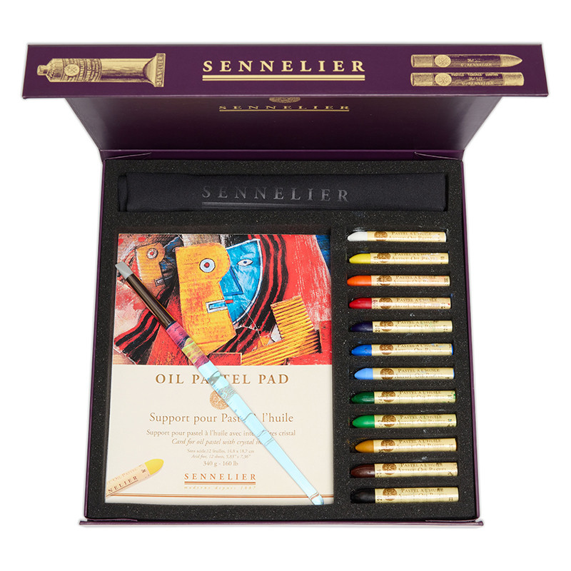 Zestaw prezentowy marki Sennelier - komplet profesjonalnych pasteli olejnych, 12 kolorów + akcesoria.