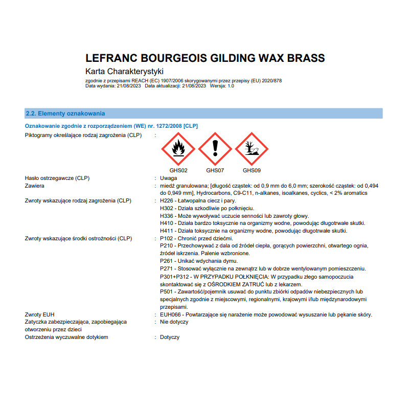 Pasta pozłotnicza Lefranc & Bourgeois na bazie naturalnego wosku pszczelego i szlachetnych pigmentów metalicznych. Wydajna i trwała. Słoiczek szklany 30ml. Więcej szczegółów