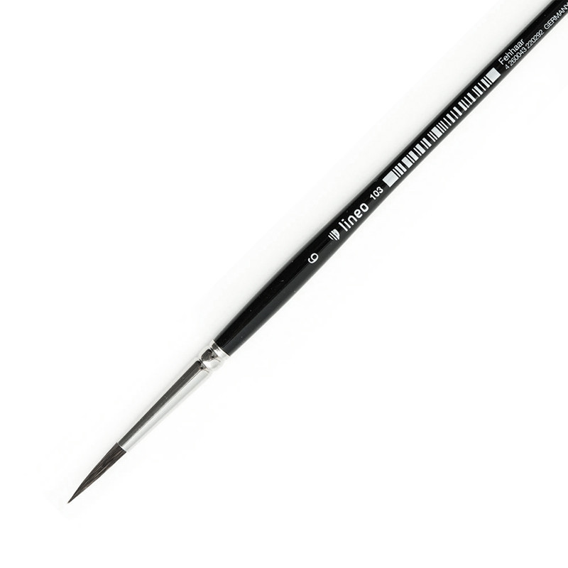 Okrągły pędzel akwarelowy z linii Lineo Seria 103 wykonany jest z wyselekcjonowanego włosia wiewiórki. Producent zastosował bezszwową niklową skuwkę oraz krótki, czarno lakierowany trzonek. Dzięki naturalnym właściwościom włosia wiewiórki oraz pełnemu brzuścowi pędzel dobrze chłonie i utrzymuje dużą ilość farby. Charakteryzuje się precyzyjną końcówką, zapewniającą wyjątkowy komfort i jakość malowania. Pędzel jest tradycyjnie wykonywany ręcznie w Niemczech.