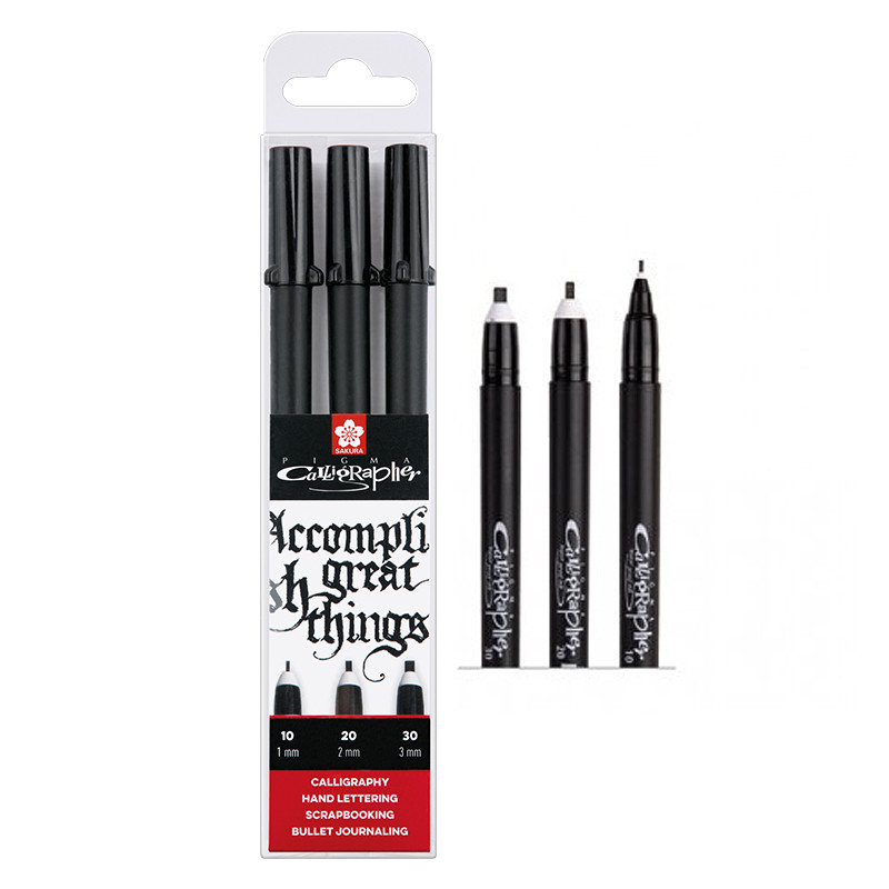 Zestaw 3 pisaków do kaligrafii Pigma Calligrapher japońskiej marki Sakura. Pisaki posiadają nylonową końcówkę co zapewnia im trwałość i gładkie rozprowadzanie tuszu. Przeznaczone do kaligrafii, liternictwa, scrapbookingu.