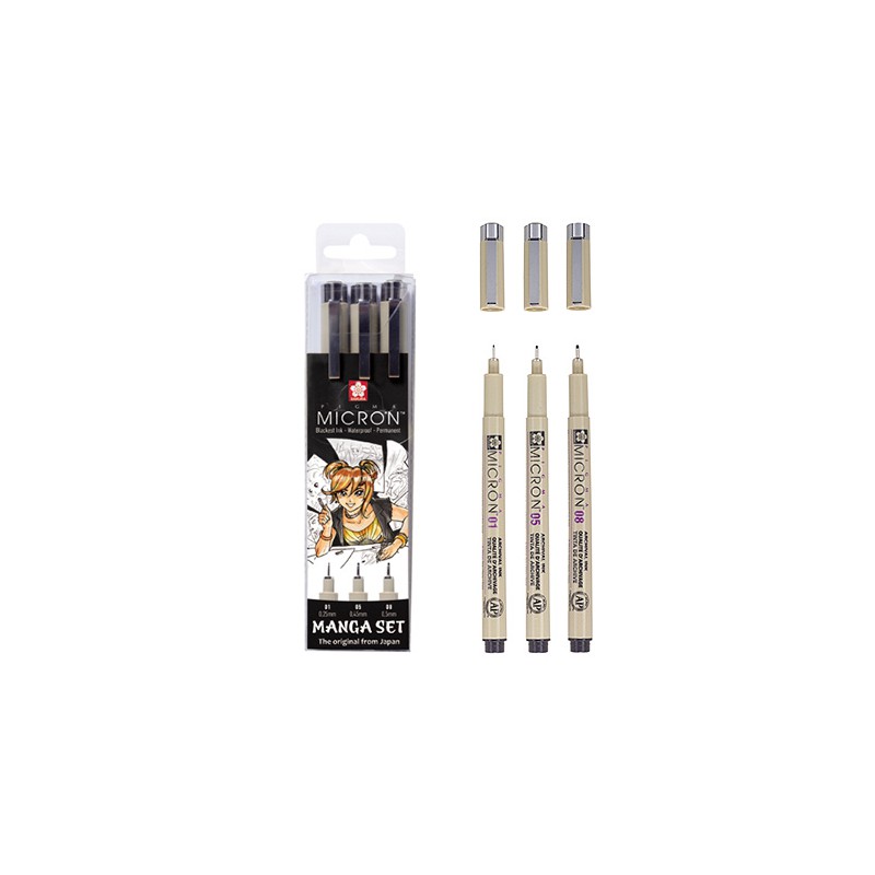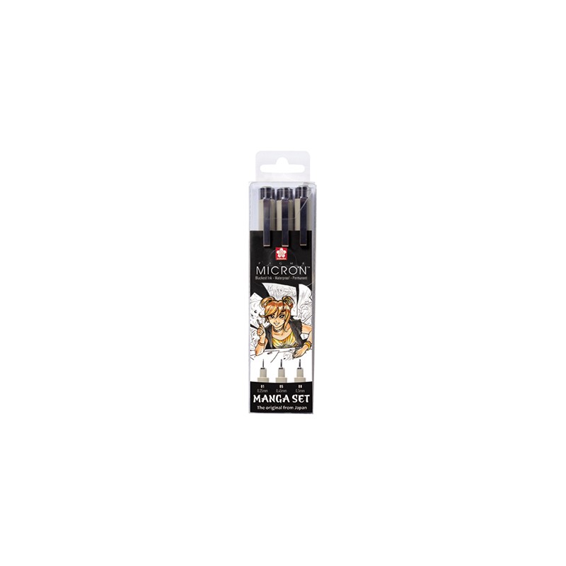 Zestaw pisaków precyzyjnych Pigma Micron - Manga Set japońskiej marki Sakura. Zestaw zawiera 3 pisaki w kolorze czarnym o rozmiarach: 01 - 0.25mm, 05 - 0.45mm oraz 08 - 0.50mm. Umieszczone w plastikowym etui.