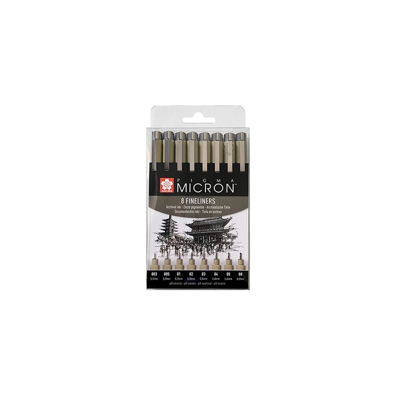 Zestaw 8 pisaków precyzyjnych Pigma Micron Fineliners japońskiej marki Sakura. Zestaw zawiera: