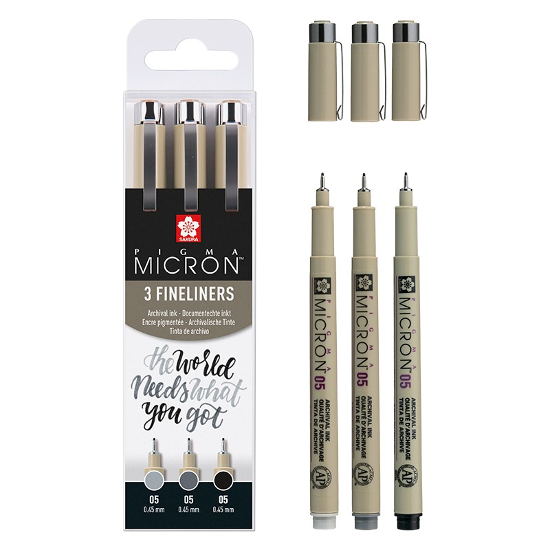 Komplet 3 pisaków Pigma Micron o grubości 05 (0.45 mm) w odcieniach szarości i czerni. Tusz archiwalny, trwały i szybkoschnący. Więcej szczegółów
