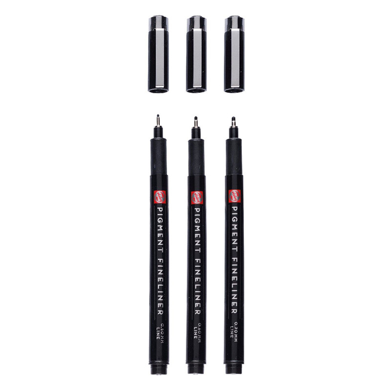 Komplet cienkopisów Pigment Fineliner marki Talens. 3 cienkopisy z wodnym, pigmentowym tuszem w kolorze czarnym. Każdy z nich posiada końcówkę o innej szerokości. Cenkopisy polecane do szkiców pod akwarelę, rysunków technicznych, line-art'u i dotwork'u. Lekka obudowa wykonana z plastiku wygodnie leży w dłoni, a solidna końcówka zapewnia równomierny przepływ tuszu.