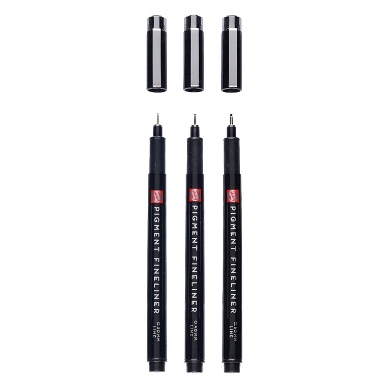 Komplet cienkopisów Pigment Fineliner marki Talens. 3 cienkopisy z wodnym, pigmentowym tuszem w kolorze czarnym. Każdy z nich posiada końcówkę o innej szerokości. Cenkopisy polecane do szkiców pod akwarelę, rysunków technicznych, line-art'u i dotwork'u. Lekka obudowa wykonana z plastiku wygodnie leży w dłoni, a solidna końcówka zapewnia równomierny przepływ tuszu.
