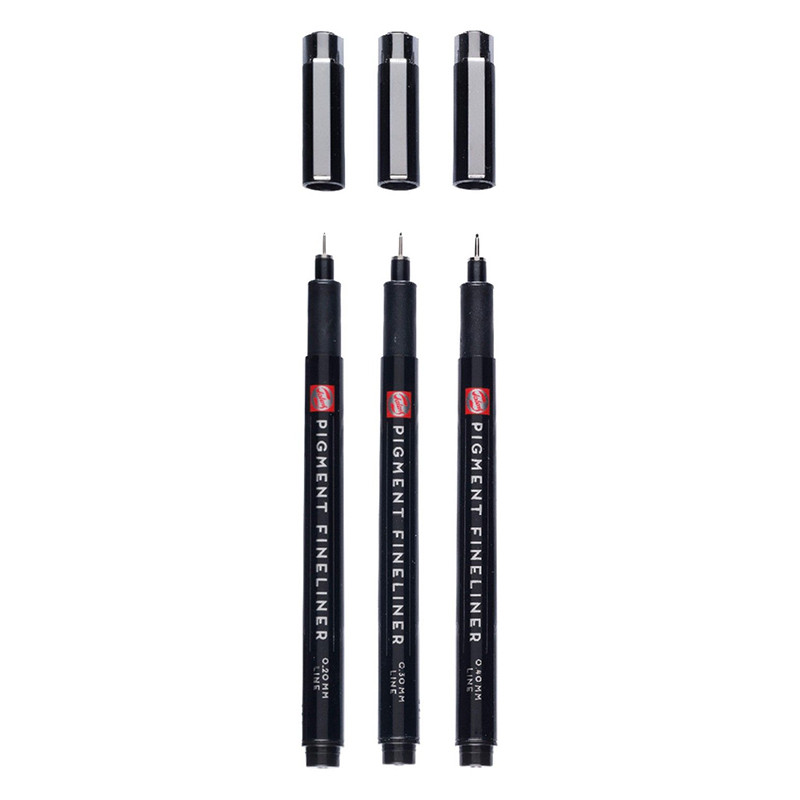 Komplet cienkopisów Pigment Fineliner marki Talens. 3 cienkopisy z wodnym, pigmentowym tuszem w kolorze czarnym. Każdy z nich posiada końcówkę o innej szerokości. Cenkopisy polecane do szkiców pod akwarelę, rysunków technicznych, line-art'u i dotwork'u. Lekka obudowa wykonana z plastiku wygodnie leży w dłoni, a solidna końcówka zapewnia równomierny przepływ tuszu.