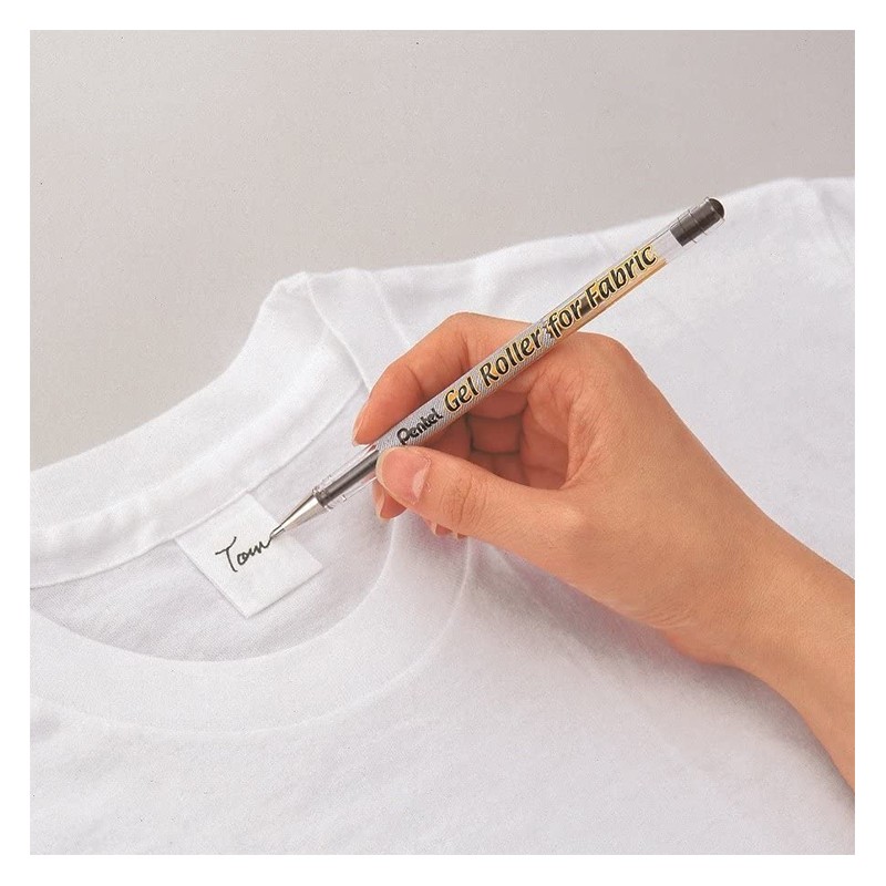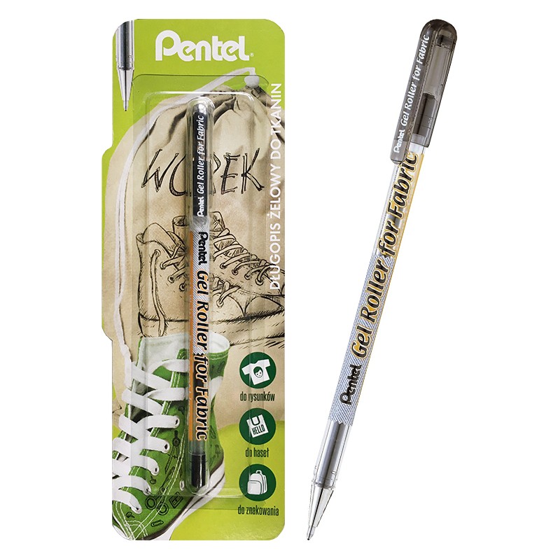 Żelowy długopis do tkanin Gell Roller for Fabric marki Pentel w kolorze czarnym. Wodoodporny tusz pigmentowy, trudnospieralny. Więcej szczegółów