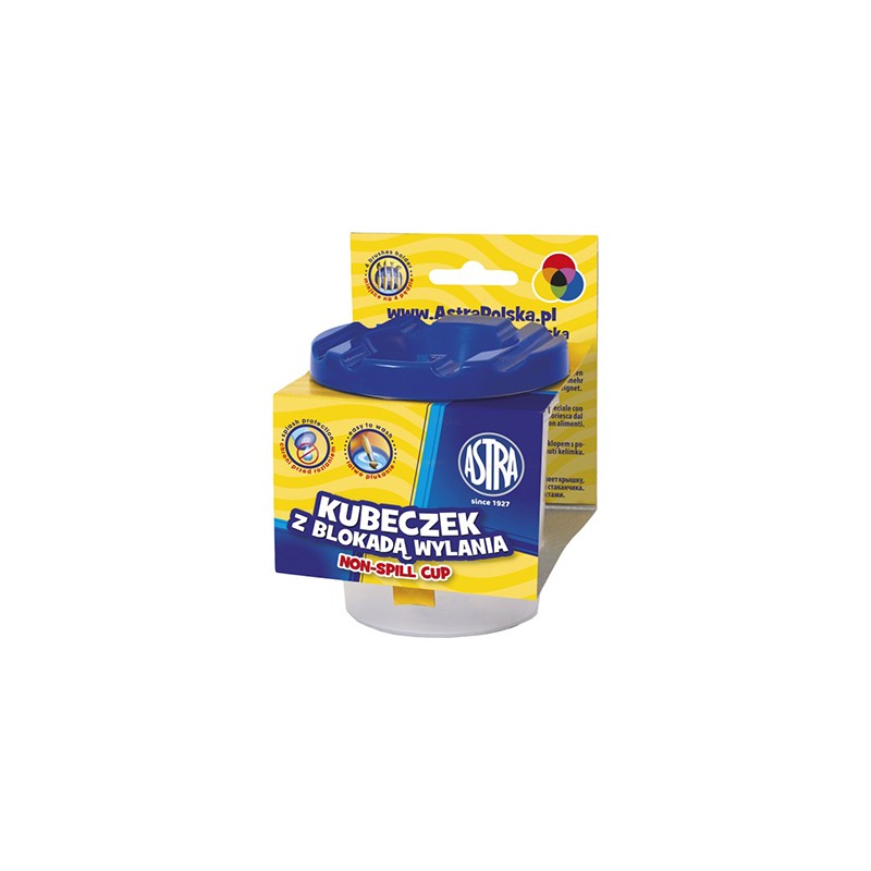 Kubeczek z blokadą wylania marki Astra. Plastikowy pojemnik na wodę i do mycia pędzli wyposażony w element zapobiegający wylaniu się wody. Więcej szczegółów