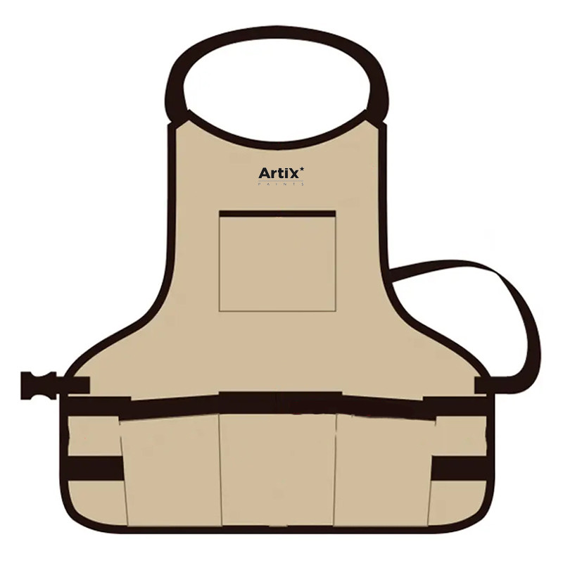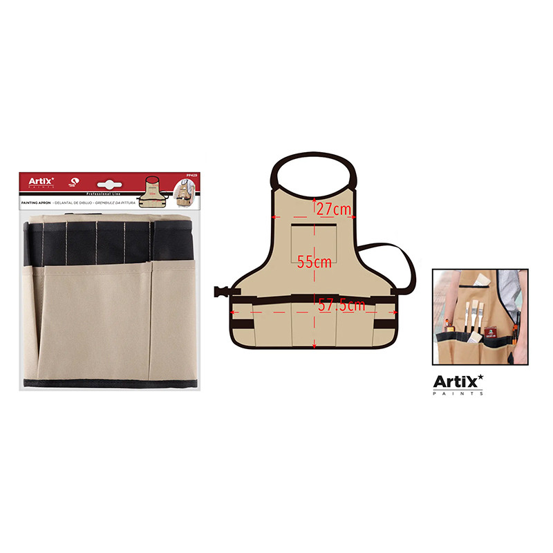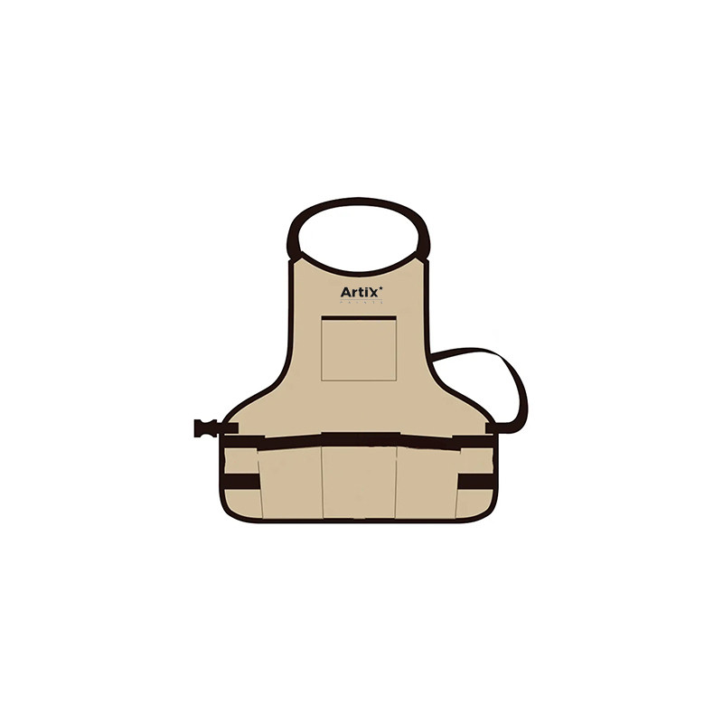 Fartuch polecany do wszelkich prac artystycznych w studiu i plenerze. Wykonany z wytrzymałego materiału, który od spodu powleczony jest specjalną powłoką zapobiegającą przesiąkaniu. Długość fartucha 55 cm. Szerokość: 57.5 cm. długość tylnego paska ok 65 cm - fartuch zapinany na klamrę typu "fastex". Przednia część fartucha posiada 5 dużych i 8 mniejszych kieszeni oraz dwa paski do zaczepiania akcesoriów. Na wysokości klatki piersiowej umieszczono 1 płaską kieszeń powyżej której znajduje się logo marki Artix. Wszystkie krawędzie i łączenia zostały dodatkowo obszyte, aby uniknąć strzępienia materiału.
