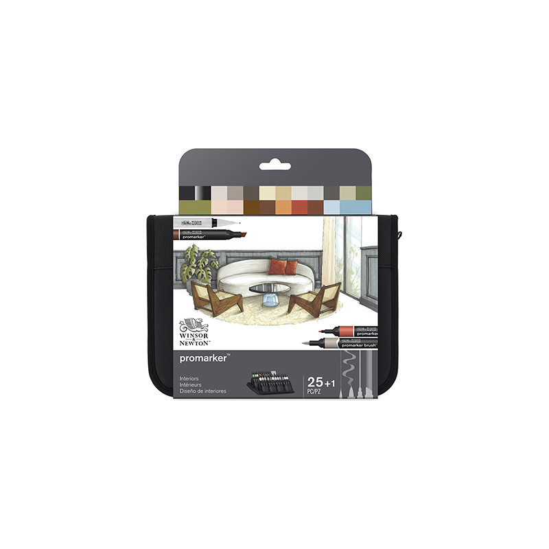 Interiors Set. Zestaw pisaków Promarker, Brushmarker oraz czarnych cienkopisów Fineliner. Profesjonalne markery dla grafików. Umieszczone w płóciennym etui. Więcej szczegółów