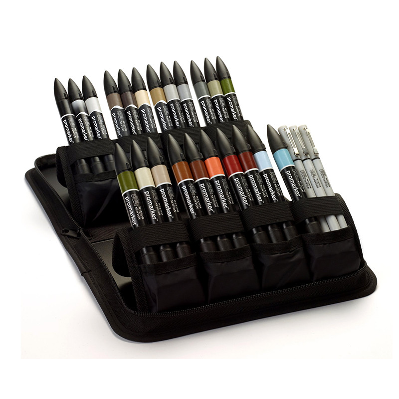 Zestaw Interiors Winsor & Newton – pisaki serii Promarker, Brushmarker i Fineliner. Kompozycja 25 pisaków + piórnik. Oryginalny produkt marki W&N.