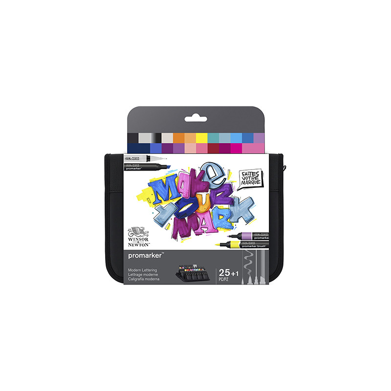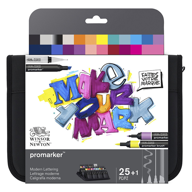Zestaw Modern Lettering Winsor & Newton – pisaki serii Promarker, Brushmarker i Fineliner. Kompozycja 25 pisaków + piórnik. Oryginalny produkt marki W&N.