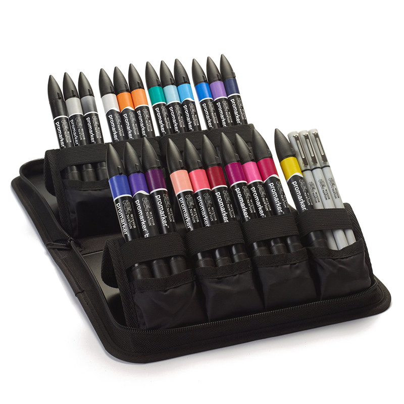 Pisaki zostały umieszczone w oryginalnym płóciennym piórniku z logo Winsor & Newton. W jego wnętrzu znajdują się elastyczne przegródki na każdy marker z osobna. Specjalne podkładki i rzepy umożliwiają ustawienie pisaków w pozycji stojącej dla lepszego dostępu i łatwiejszego wyboru.