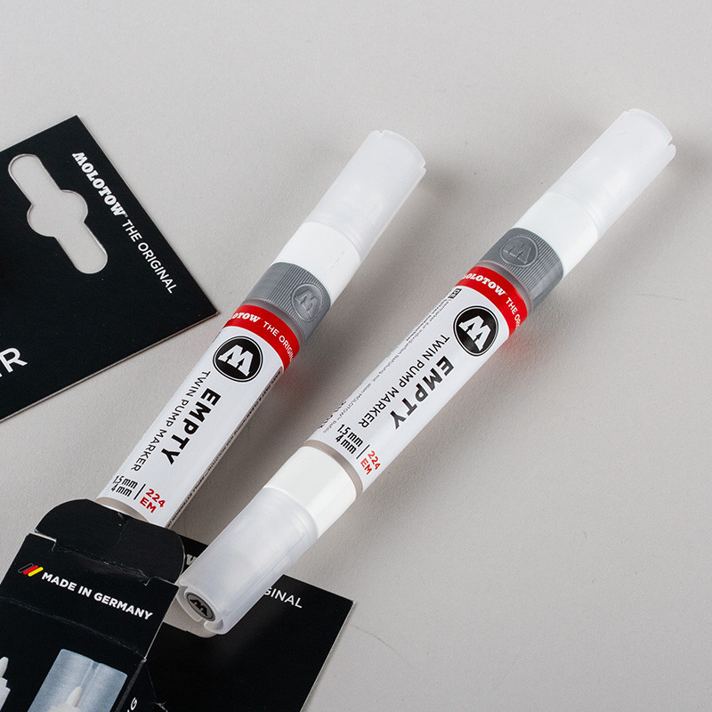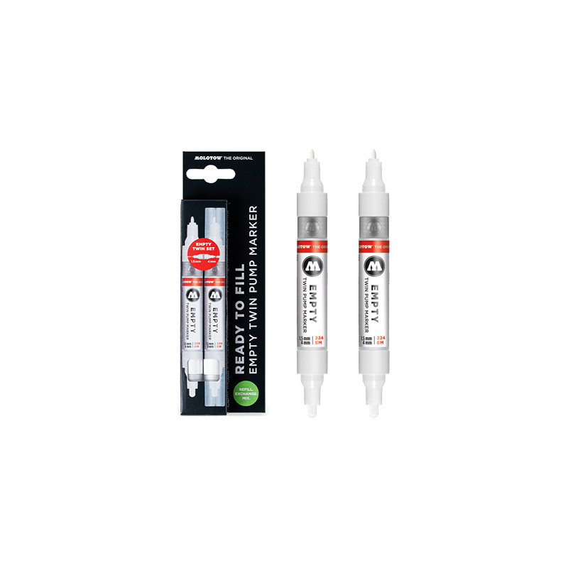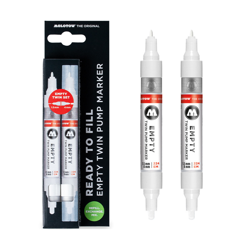 Komplet 2 pisaków do napełniania marki Molotow. Dwustronne pisaki posiadają dwie końcówki: Round 4 mm oraz Bullet 1.5 mm. Zbiorniczek pisaka pomieści 5 ml płynu. Markery Empty Twin Pump są kompatybilne z większością tuszy i płynnych farb. Wysokiej jakości komponenty sprawiają, że farba wydostaje się z pisaka w sposób płynny i równomierny.