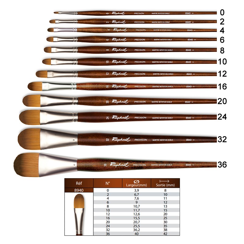 Seria 8940 – Raphael Precision nr 12. Artystyczne pędzle malarskie 'koci język', z elastycznego włosia syntetycznego, dającego dużą kontrolę nad farbą, przeznaczone do farb olejnych i akrylowych.