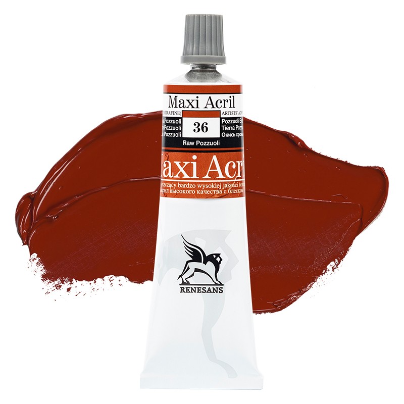 Farba akrylowa Maxi Acril polskiej wytwórni farb Renesans. Po wyschnięciu pozostawia błyszczącą, odporną na działanie światła powierzchnię. Dzięki wysokiemu nasyceniu pigmentem, kolory są żywe i trwałe. Polecana dla uczniów, studentów hobbystów i profesjonalistów. Znakomicie sprawdza się na większości odpowiednio przygotowanych podłożach, jak płótno, karton, drewno, plastik.