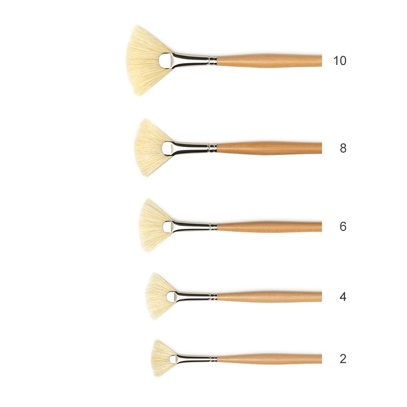 Wachlarzowy pędzel z naturalnym włosiem szczecinowym do malowania farbami olejnymi, akrylowymi i gwaszami. Wyselekcjonowane włosie cechuje się dużą wytrzymałością i zachowaniem pierwotnego kształtu.