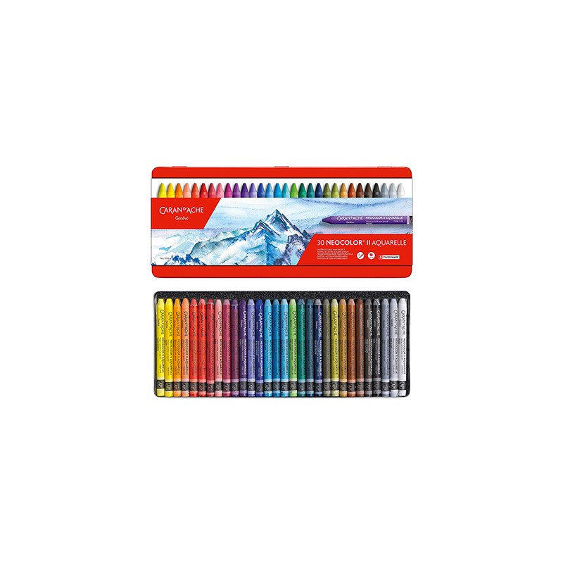 Kultowe woskowe pasteli olejne Neocolor marki Caran d'Ache. Podstawowa gama kolorystyczna pozwala tworzyć nowe barwy i odcienie. Pastele akwarelowe rozpuszczają się w wodzie – ich kremowa konsystencja, aksamitna faktura i intensywne kolory sprawiają, że praca nimi jest bardzo przyjemna i satysfakcjonująca. Pastele NEOCOLOR II Aquarelle są wysoce odporne na światło, przez co nie zmieniają swoich kolorów przez długi czas. 30 sztyftów o średnicy 8.65 mm umieszczono w klasycznym, metalowym etui w kolorze czerwonym.