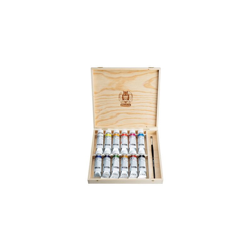 Zestaw farb olejnych serii Akademie marki Schmincke, 12 kolorów w tubkach o pojemności 60 ml + pędzel + drewniana kaseta.