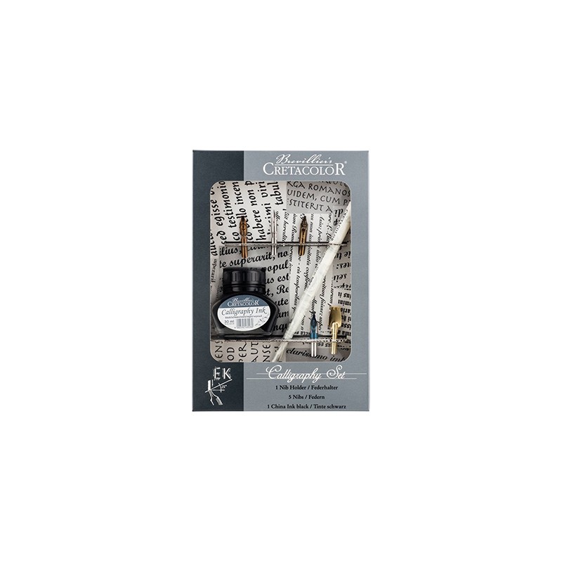 Zestaw do kaligrafii austriackiej firmy Cretacolor. Polecane początkującym i zaawansowanym kaligrafom. Komplet zawiera 5 stalówek różnego typu, 1 bambusową obsadkę oraz słoiczek czarnego tuszu chińskiego o pojemności 30ml. Całość umieszczona w estetycznym, kartonowym pudełku z przezroczystą witrynką. Zestaw polecamy jako oryginalny prezent dla każdego estety.