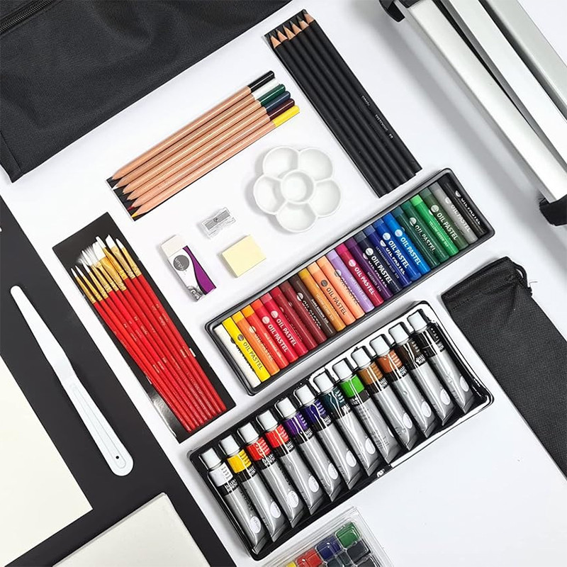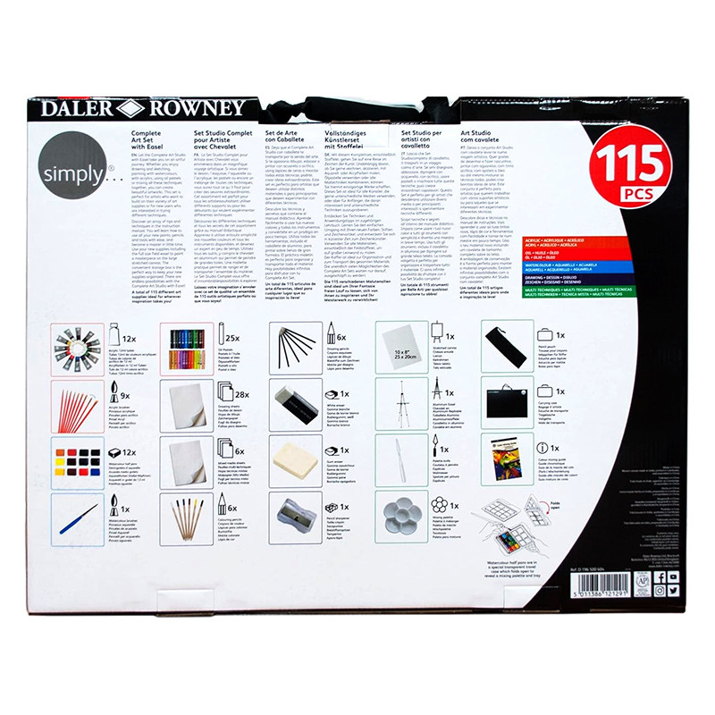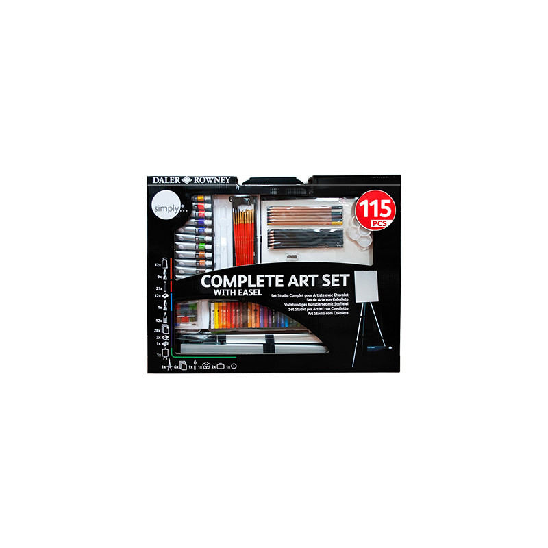 Complete Art Set with Easel Simply Daler Rowney – kompletny zestaw artystyczny wraz z aluminiową sztalugą. 115 elementów.