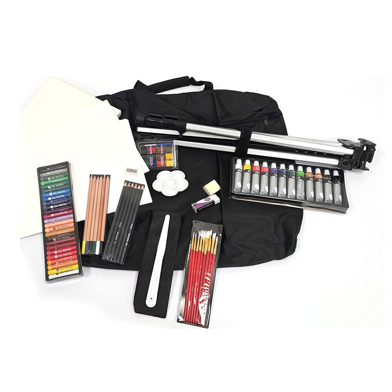 Obszerny zestaw artystyczny do tworzenia prac w technikach malarskich i rysunkowych. Produkty serii Simply to bardzo dobra jakość odpowiadająca studyjnej półce cenowej. W zestawie znajdują się zestawy farb wodnych - akrylowych i akwarelowych w kostkach, zestawy kredek, pasteli olejnych i ołówków, papier w blokach, podobrazie i akcesoria. Przenośna, poręczna torba pozwala zabrać ze sobą wszystkie niezbędne akcesoria w plener. Aluminiowa sztaluga dołączona do zestawu jest lekka i łatwa w obsłudze. Prezentowany komplet pozwoli na kreatywne tworzenie prac w technice mix-media.