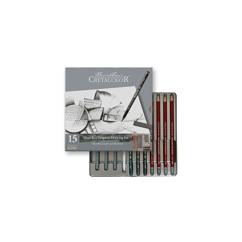Komplet szkicowo-rysunkowy Silver Box marki Cretacolor. 15-elementowy zestaw grafitów, sztyftów i akcesoriów do tworzenia prac w tonacji szarości i czerni. Różnorodność zawartych mediów pozwala na tworzenie oryginalnych prac od szkiców po szczegółowe rysunki. Wszystkie elementy zestawu umieszczono w plastikowej wytłoczce i zamknięto w solidnym, metalowym pudełku, które pozwala na ich bezpieczne przechowywanie.