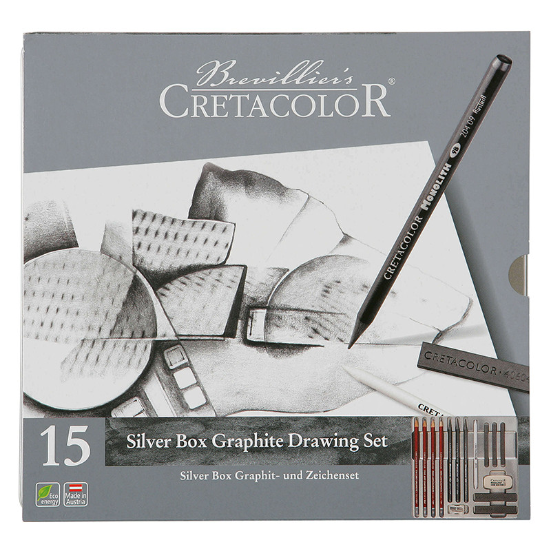 Silver Box Graphite & Drawing Set – komplet do szkicu i rysunku marki Cretacolor, 15 elementów.