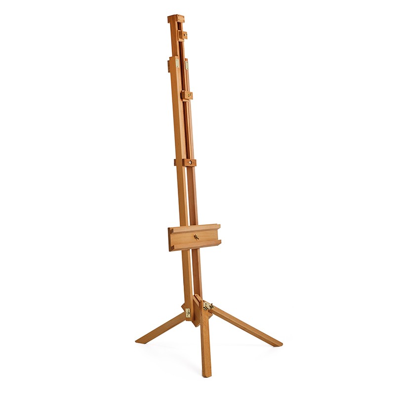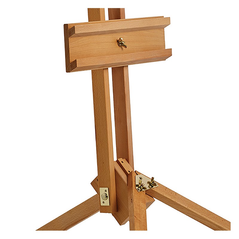 Stabilna, wysoka sztaluga wykonana z sezonowanego drewna bukowego impregnowanego olejem. Sztaluga dzięki swojej konstrukcji umożliwia jednoczesne umieszczenie dwóch podobrazi np. w celu stworzenia kopii. Rozsuwany teleskopowo trzon sztalugi przy maksymalnym wysunięciu stwarza przestrzeń na postawienie podobrazia o wysokości aż 180 cm! Regulacja ruchomych elementów odbywa się przy użyciu śrub "motylków" Metalowy element w kształcie litery T służy jako blokada kąta nachylenia sztalugi. Sztaluga wymaga jedynie przykręcenia głównej podwójnej półki.