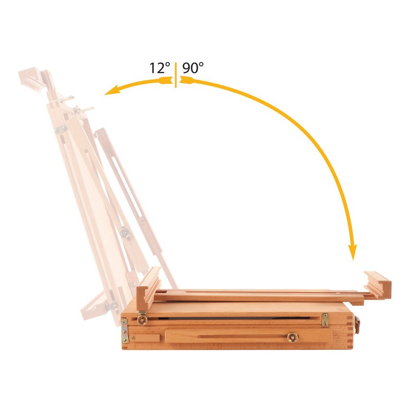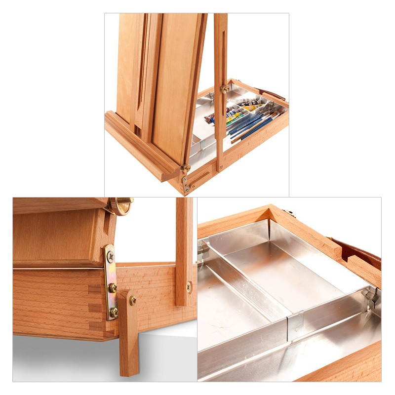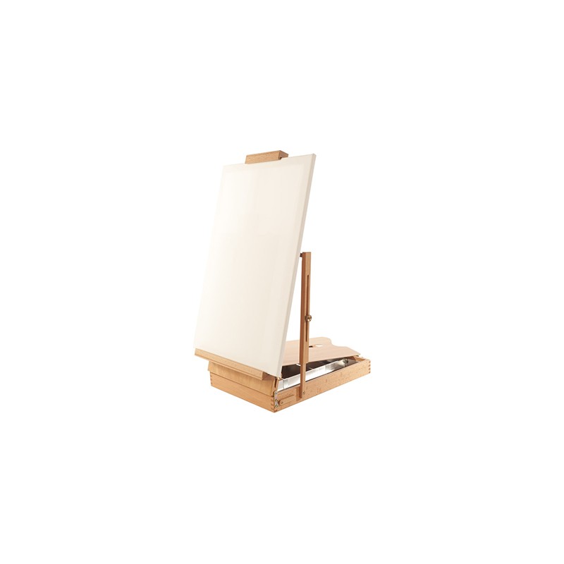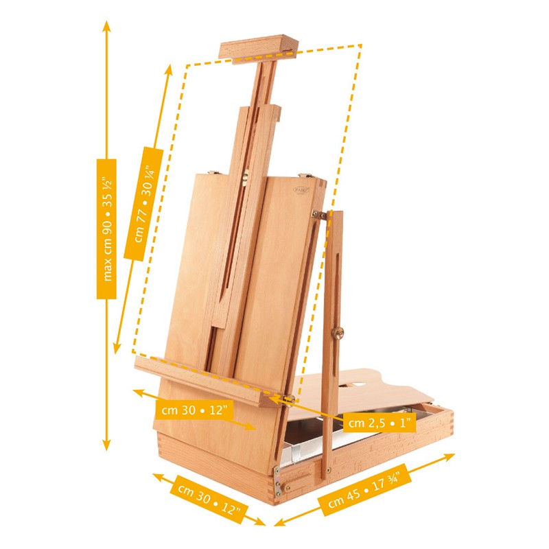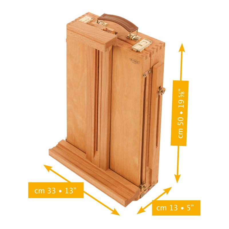 Skrzynkowa sztaluga stołowa marki MABEF. Drewno bukowe olejowane. Stabilna konstrukcja, wyposażona w szufladę. Maksymalna wysokość podobrazia to 77 cm. Więcej szczegółów