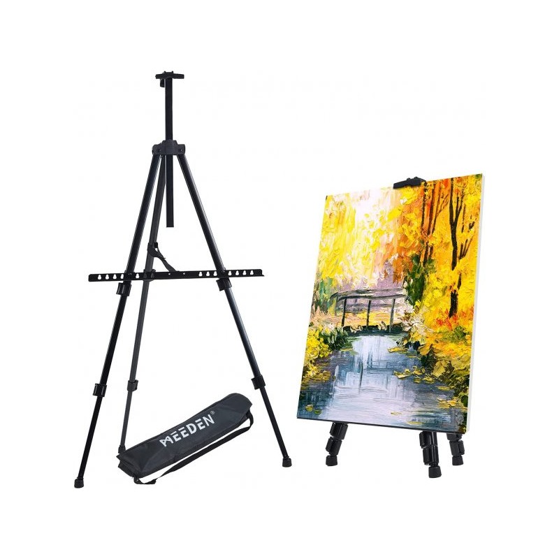 Lekka, uniwersalna sztaluga wykonana z aluminium, przeznaczona głównie do malarstwa plenerowego ze względu na swoje właściwości. Regulowana dolna półka oraz górny chwytak zapewniają stabilność dla płótna. Teleskopowe nogi sztalugi regulowane są za pomocą prostego mechanizmu, a cała konstrukcja jest niezwykle lekka i poręczna. Aluminiowa sztaluga plenerowa w komplecie posiada nylonowe etui z paskiem. Maksymalna wysokość płótna jakie można umieścić na sztaludze to 83 cm. Wysokość sztalugi przy całkowitym rozłożeniu to około 165 cm. Waga 1,5 kg.