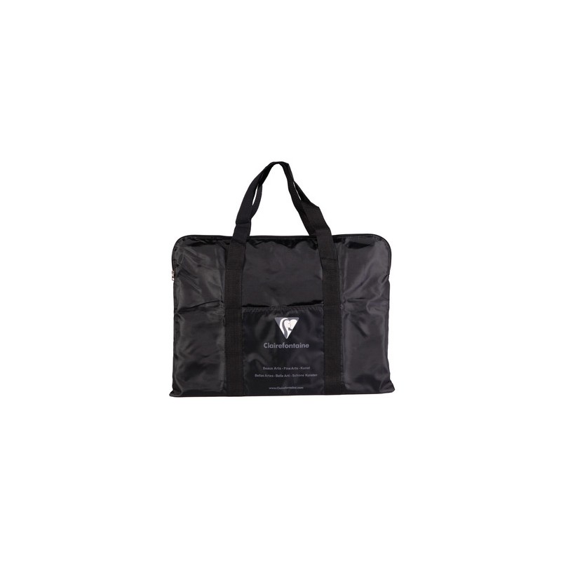 Portfolio Clairefontaine – lekka, nylonowa, czarna torba do przenoszenia prac. Wyposażona w szerokie, wygodne paski na ramię, zapinana na zamek. Na froncie znajduje się jedna kieszeń oraz nadrukowane jest logo firmy.