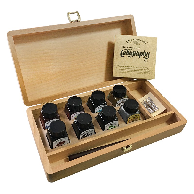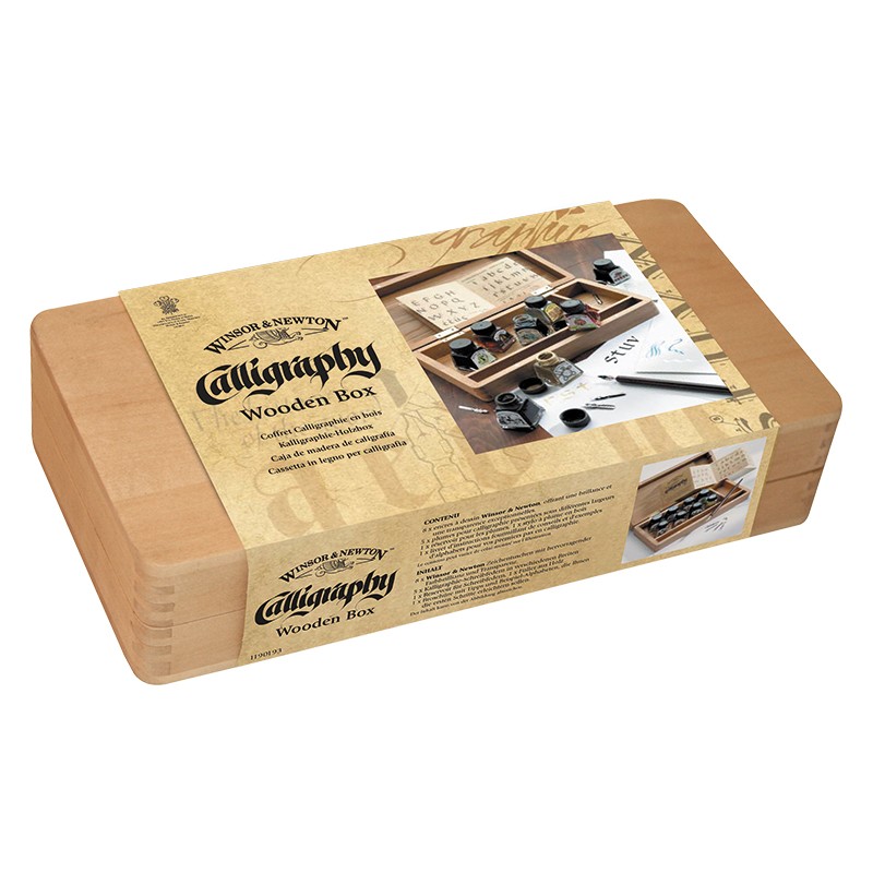 Komplet Calligraphy Wooden Box Winsor & Newton zawiera 8 szklanych słoiczków o pojemności 14 ml z permanentnym, transparentnym tuszem kreślarskim. Dodatkowo dołączona jest 1 drewniana obsadka, 5 wymiennych stalówek o różnych szerokościach oraz ulotka instruktażowa. Wszystkie elementy umieszczone są w drewnianej, eleganckiej kasecie zamykanej na klamrę. Jest to idealny zestaw dla każdego kto chcę rozpocząć przygodę z kaligrafią oraz dla już zaawansowanych artystów.